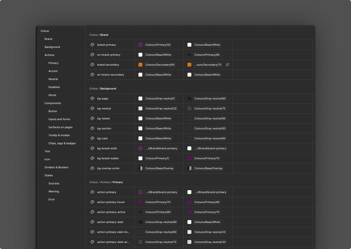 Primitives: pure ramps (e.g., Colours.Gray neutral.5, 10… 90, Primary, Secondary).
