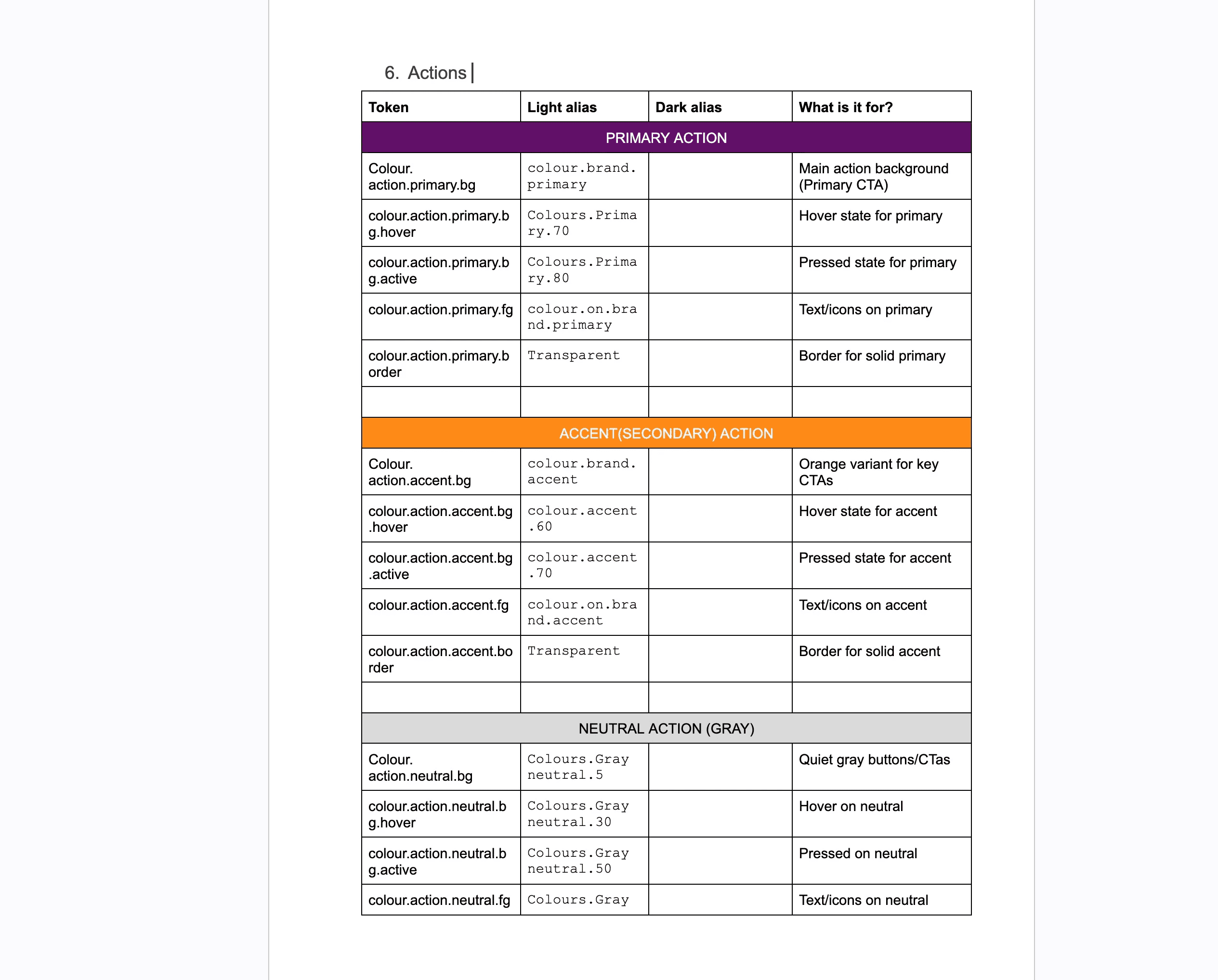 Actions: three families — Primary (purple), Accent (orange), Neutral (grey) — plus Ghost and Link.