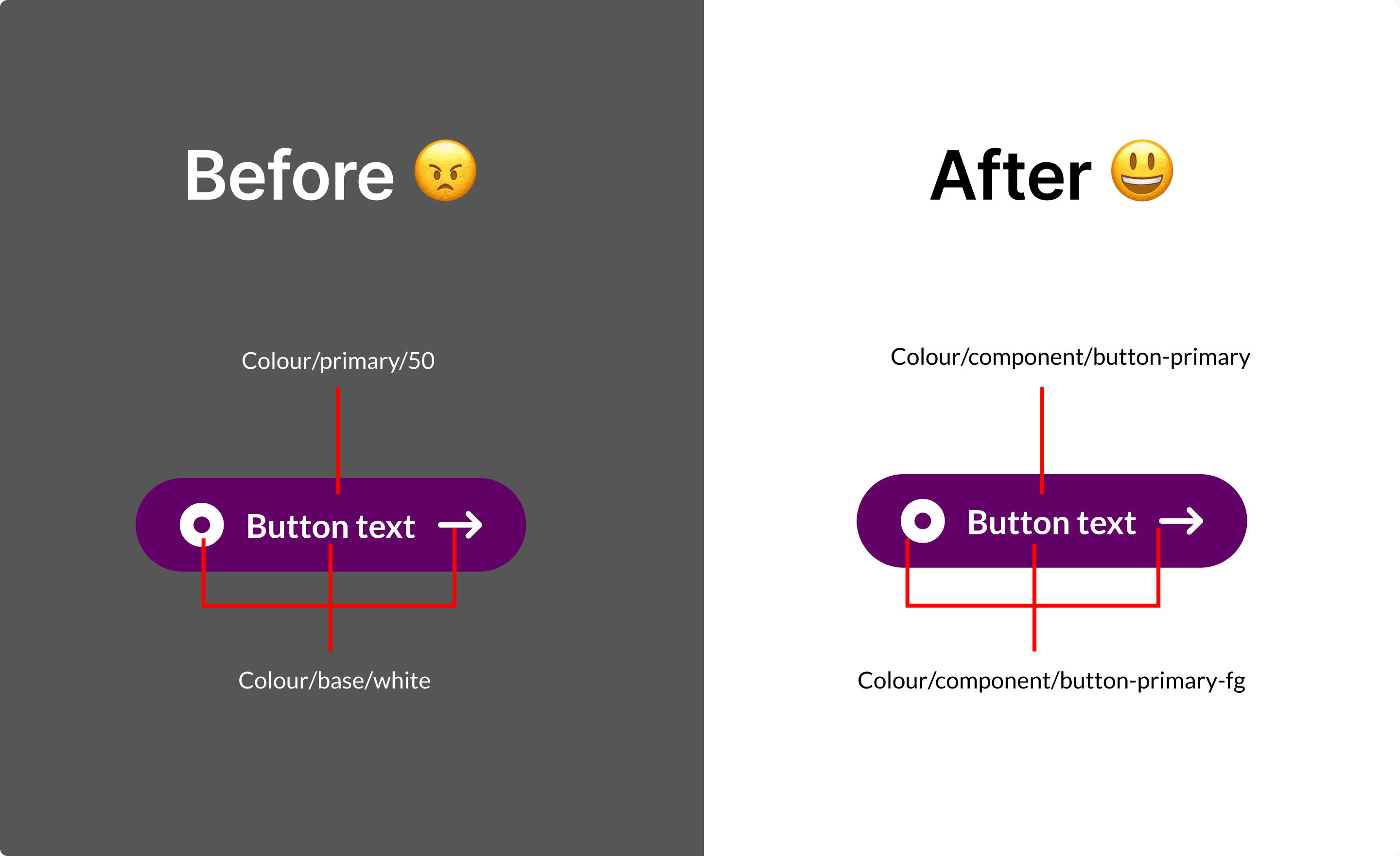 After: token-first system, normalised ramps, light/dark parity, faster theming